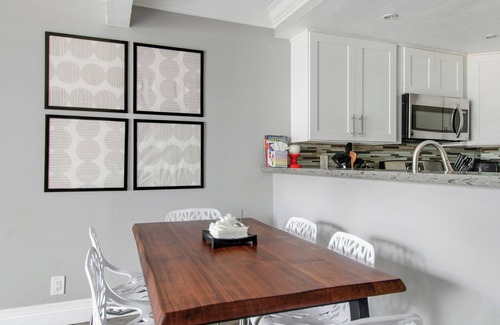 The living room is bright and fun with a comfortable leather sofa sectional with chaise. Perfect to unwind and relax after a long day at the parks. We have a flat screen HDTV with movies channels. The dining area has seating up to 6 people comfortably.