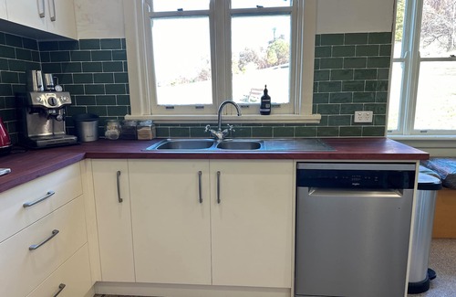 The kitchen is well equiped, with a large 90cm electric oven and induction cooktop, a dishwasher, microwave and coffee maker (bring your own blend) as well as a full compliment of cooking utensils, cutlery and crockery and glasses and mugs. A cosy wood heater, gorgeous bay window seat and a long table that seats 10, makes it a perfect place to hang out with friends and family, chatting over a glass of wine or cups of tea or coffee made with the crystal-clear mountain spring water that supplies all the house's needs.