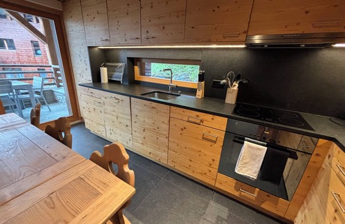 This apartment has a double and bunk room with 2 bunk beds, a very large sitting room/kitchen with a dining table for 6. The kitchen is well equipped with induction hob and oven and microwave, big fridge/freezer and coffee machine. Smart TV. Lots of storage and space for ski gear, including helmets etc. There is also large balcony to sit/eat on to appreciate the great views. Underfloor hearting throughout.