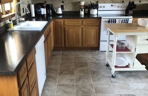 -The kitchen is fully stocked! Glassware, dishware, silverware, cooking utensils, pots/pans, large fridge/freezer with ice maker, toaster oven, baking essentials, Keurig, drip coffeemaker, microwave, blender, electric tea kettle, and dishwasher.