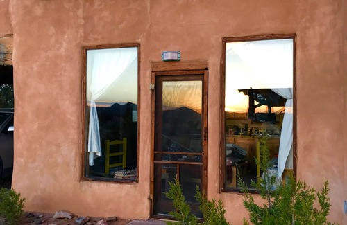 Our casita is cozy and carefully designed in the traditional local adobe style with hand-plastered interior walls, viga ceilings, and a wonderful kiva fireplace. The interior photos of the casita were taken by a professional photographer, so they are terrific, but we'd like to emphasize our casita is a cozy 750 square feet total. With amazing sunset views of the nearby Cerrillos Hills, the casita is nestled into the landscape with 360 degrees of complete privacy.