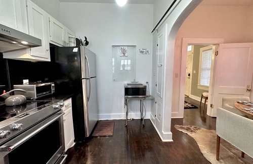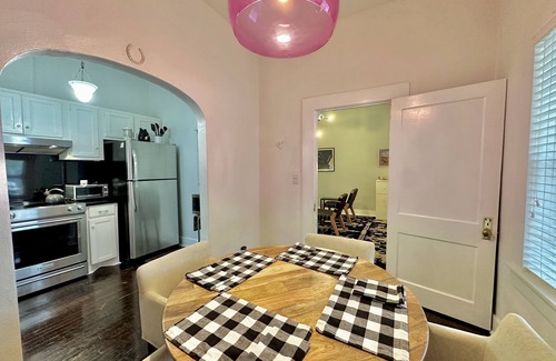 The Downtowner Marfa was renovated in 2018 and offers one of the best locations in town! Across the street from the Paisano, One block from the Courthouse, Margaret's, Garza Marfa, Communitie, Pronghorn, 6Whiskey, Frama, Aster, Ayn Foundation, and parts of JUDD and Chinati collections. The Saint George is just 2.5 blocks away! This craftsman style adobe has beautiful hardwood floors, full kitchen with 2021 KitchenAid range, modern bathroom with steam shower, full size laundry machines, 100 mpbs internet, Dish satellite, high end linens, and comfortable, stylish furnishings. The Downtowner has everything you need to have a fantastic time in Marfa. Rent our 2 bed, 1 bath sister property the West Texan #744032 right next door if you have a larger party but want your privacy!