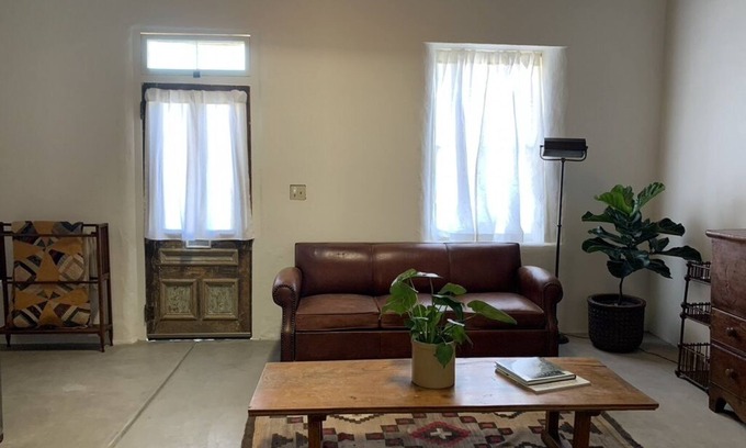 The Folklore Hotel is an old-world experience nestled within a collection of folk art; primitive antique interiors complimented with high ceilings, concrete floors, bathed in natural desert light throughout. There is one bedroom a large kitchen, dinning room with living room, office and fireplaces, one bathroom and a native garden patio with outdoor living amenities.