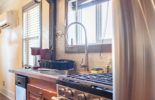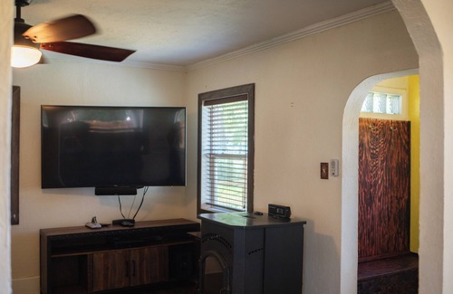 This unique place has a style all its own. Completely redone from floor to fixtures, this stay hosts 1 comfortable bedroom, a double vanity bathroom and spacious stand-up shower, massive TV and full kitchen. The yard is private & completely fenced for your convenience! We love to welcome your well behaved furry friends.