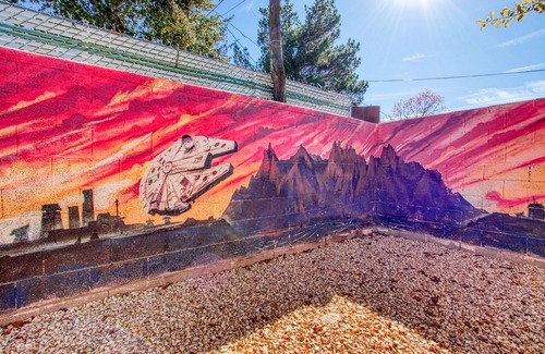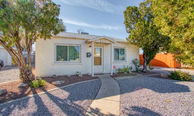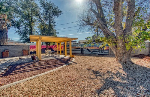 Our urban modern southwest home is adorned with New Mexico art that you can own by local artist Michelle Augustyniak. Sleeps 4 in two private bedrooms (queen beds in both) or 6 if air mattress is used. Large, shaded backyard with New Mexico monument-themed murals by nationally-recognized artist Todd Hebenstreit.