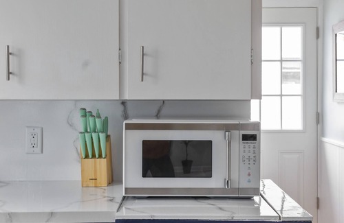 -Fully stocked kitchen with microwave, gas range, and coffee bar.