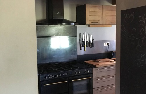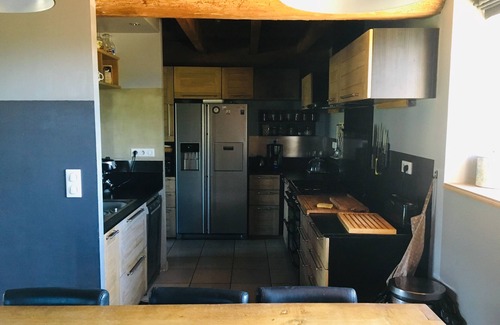 Description of the House: an open fitted kitchen (dishwasher, toaster, small robot, pressure cooker, American fridge freezer)