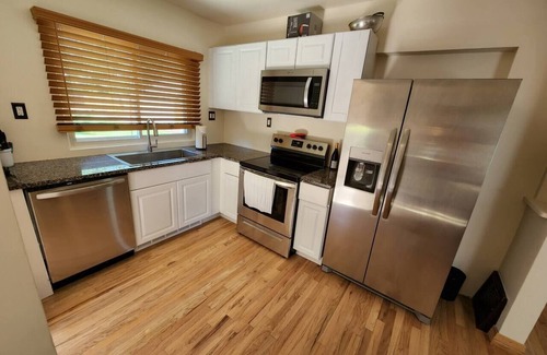 Adorable house 1 block from campus. Has a very unique feel of historic Fort Collins in a completely updated house. Everything you need with 2 king size beds, a huge back yard, and a great spot for hanging out, BBQ's visiting CSU and being walking distance from everything you need. We even have a garage to store your things. 4 parking spots in the back, and a driveway fits at least two cars in the front. The location is top notch and we are here to make sure you have everything you need. Come inside to an open floor plan. To your left is a large living room with a 60 inch TV, to your right two bedrooms and a bathroom and straight ahead a kitchen that leads to a laundry room and outside to your private large backyard. Tall ceilings and lots of lighting make the space. You have access to the whole upper unit of the house and yard. There is a lower unit with no shared spaces and a separate entrance. let us know how we can help you have a great stay ! happy to help! A happening Street with mature trees. Watch people bike and walk by all day heading to campus or work. It is in the heart of Fort Collins with campus west and downtown close by. Bike or walk to anything you need. For parking there is a driveway in the front and a 4 spot parking lot in the back for all your needs. This property is a duplex. There is a unit below which does NOT share any spaces with the upstairs unit such as the laundry or yard. The lower unit has an entrance of its own.