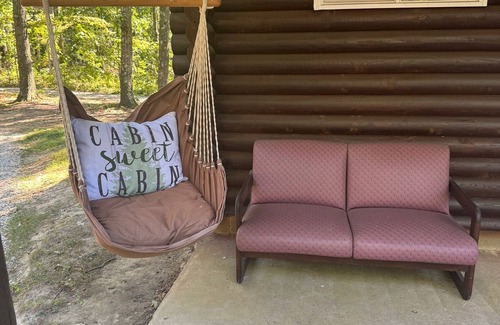 Want to get away? Our Woodland themed log cabin out in the woods is a perfect spot to get away! This beautiful retreat features a cozy open area log cabin with 1 queen bed and 1 twin bunk bed, perfect for unwinding after a day of exploring. With amenities like central heat and air conditioning, WiFi, and smart TV, you will feel right at home. Kitchenette area features an apartment size refrigerator with freezer, microwave, coffee pot and a nice round table with seating for 4. The bathroom is stocked with all the essentials you need. The covered front porch has a couch and hanging swing with a huge firepit and free firewood just a few feet away!
