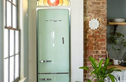 The kitchen is fully equipped with brand new appliances including: a retro fridge,
