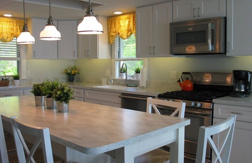 The master bedroom has a queen bed, another bedroom has 2 twin beds, and there is a twin in the third bedroom. The bathroom has a shower and a vanity with a double sink, and there is also a half bath. The brand-new kitchen has stainless steel appliances and an 8-foot island that seats 6 or more people. Towels and linens are provided, and there is a washer and dryer.