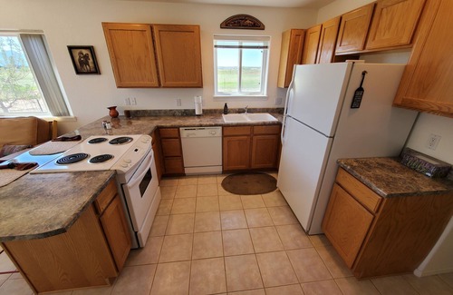 Just 3 miles north of Cortez near Hwy 491, this quiet ranch retreat offers a fully furnished equine themed guest apartment with generous parking. One queen bed and a full-sized futon can sleep up to 4 comfortably. Make lavish meals in the full kitchen or check out several fantastic restaurants in town. Enjoy panoramic views of Sleeping Ute Mountain and Mesa Verde. Keep an eye out for bald and golden eagles. Don’t be surprised if the horses wander by to greet you! Ideal central base camp for mountain bike Mecca Phil’s World, Sand Canyon, Boggy Draw and more! Well-behaved dogs are welcome for a small fee. We offer simple, zero contact check-in so all you need to do is arrive and relax! Our driveway is circular and can easily accommodate large trailers and moving vans.