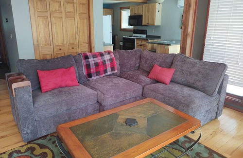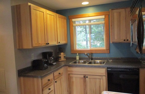 Hickory floors and cabinets, kitchen with breakfast bar seats 5. Cozy living room with flat screen TV, DirecTv.