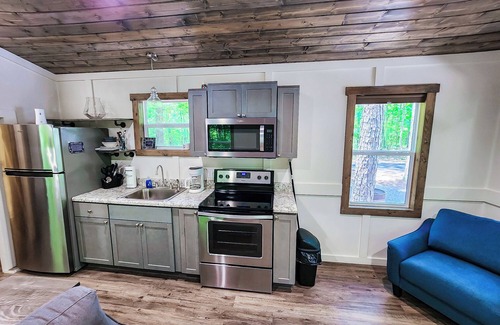 Cozy and quiet, this tiny house cabin will prove to be your new favorite getaway! This cabin proves to be the perfect outdoor retreat you are looking for with all the amenities you need. Our modern tiny house cabins are the perfect place to relax, though adventure can be found just around the corner. Our 670+ acre property sits right on Lake Guntersville. Guests can access the waterfront by use of our private roads. The cabins are tucked into the woods, not directly situated on the water. Boat parking with battery hook-ups are available. All cabins have full size kitchens, stocked with basic cookware. We ask that you wash and replace any items used during your stay. The cabins are supplied with bedding and bath linens to accommodate four. If you would prefer not to reuse bath linens, you can pack your own or request more at an additional fee. All rates include 4 guests and 2 vehicles.