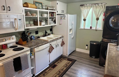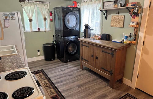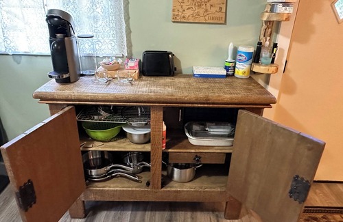 A bright dining area and hand crafted kitchen table is a great spot to work at or have a lazy Sunday breakfast spread. There is also an office space with an adjustable height desk in bedroom 2. We have a fully stocked kitchen for your use, and a propane grill outside on the back deck. In fact the house is a turn-key fully stocked ready home from home. Just bring your food and maybe the booze.