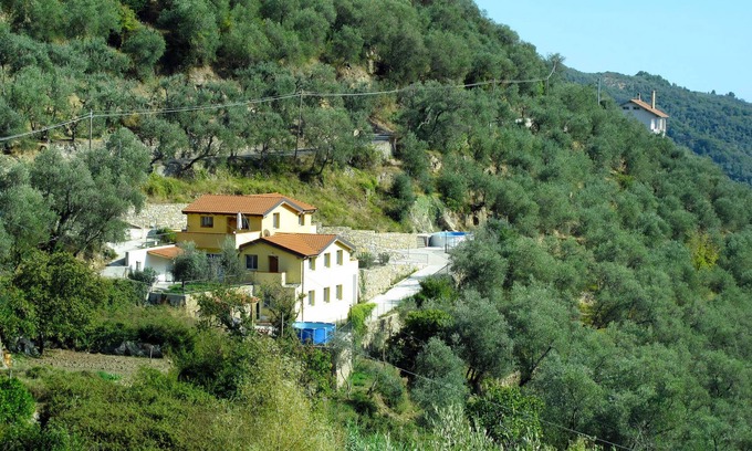 Small, beautiful residence "Clara", built in 2014, surrounded by trees. 4 apartments in the residence. In the hamlet Canneto 3 km from the centre of Prelà, 5 km from the centre of Dolcedo, 12 km from the centre of Imperia, in a quiet, sunny position on a slope, 15 km from the sea, in a cul-de-sac, in the countryside. For shared use: natural state property 1'200 m2 (fenced) with trees, natural garden, swimming pool (above ground) kidney-shaped (8 x 4 m, depth 120 cm, seasonal availability: 01.Jan. - 31.Dec.). Outdoor shower. 50 m long steep, narrow motor access to the house (ramp). Parking (limited number of spaces) at the house. Shop 3 km, supermarket 12 km, restaurant 3 km, bar 3 km, bakery 3 km, café 3 km, bus stop 300 m, railway station "Porto Maurizio" 15 km, sandy beach "Imperia - Porto Maurizio" 15 km. Please note: car recommended.