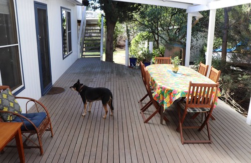 Dogs are welcome. House trained dogs are welcome inside at Adrift at Ventnor. There is a large, fully fenced garden and undercover deck. The local beach is a short stroll from the house and the off leash beach is nearby.
