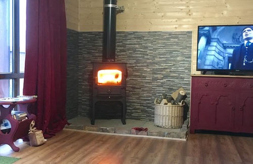 The open plan living room/kitchen features brown leather sofa & chairs, coffee table, 50" flatscreen TV, with Netflix & Wifi (free of charge) & clear view log burner (Free wood supplied). Oil filled radiator heating also.