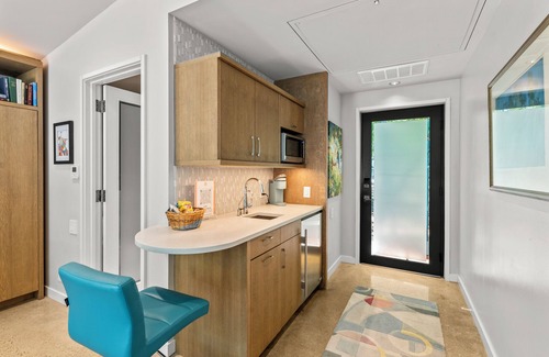 Small but mighty, the galley-style kitchenette offers everything you need with custom wood cabinetry, glass tiles, and a sleek quartz countertop. Whether you're chilling drinks in the Sub-Zero mini-fridge, making a quick snack in the microwave, or brewing your morning coffee with the Keurig, you'll feel right at home.