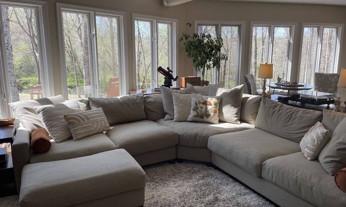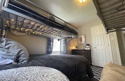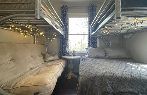 3 bedrooms - 2 on the main level and the upstairs primary suite with and a loft with queen sleeper, 1/2 bath SAUNA room and office area . The wrap around deck is new and allows you to bring the living outdoors with it's adorable dining space and plenty of room for sitting, yoga and more. The yard is ready for fun with obstacle course and firepit.