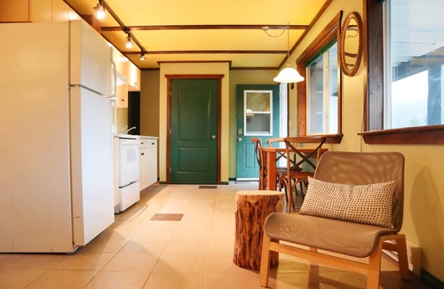 ✱ Guests have full access to their private suite and patio, plus shared amenities including the ground-floor laundry room next to the sauna, the outdoor cedar barrel sauna, and convenient parking upfront.