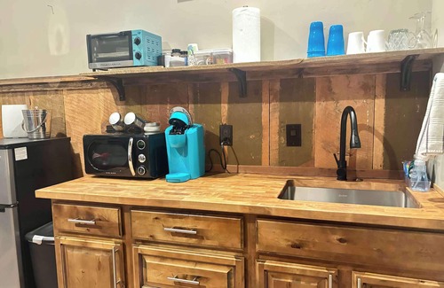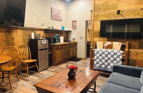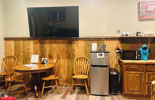 One Bedroom, One Bathroom with Mini Fridge, Microwave, Keurig and Sink to Prep Snacks for your Adventures! Small Dining Set for indoor meals. Oversized Galvanized Steel and Stone Shower, Giant Copper Antique Tub, King Size Bed, Sleeper Sofa with Queen Size Upgraded Mattress in the Living Room. Important:*** Prior to your stay, please let us know if you are going to use the sofa sleeper so we may provide the bedding prior to your arrival.*** A wall mounted "Fireplace" for adds to the Cozy Ambience. Patio with Lounge Chairs for Relaxing. Community Gas BBQ Grills and Fire Pit and Cornhole for added fun! Free Parking on site for ATV trailers upon request!