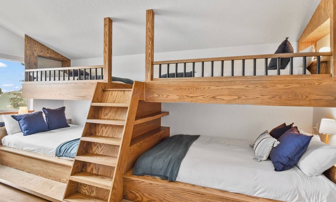 2 bunk beds - queen on bottom, twin on top, dresser, flat screen HD television, full bath/shower with granite countertops and granite surround.