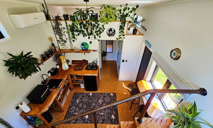 A unique tiny home with the main bedroom located on the ground level and the loungeroom above. Includes bathroom, kitchen and laundry. Amazing small and large details have our guests loving our space.