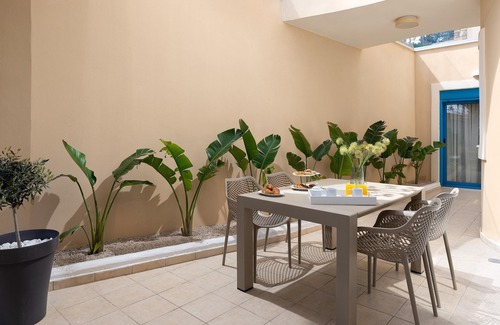 This apartment is on the ground floor and has 2 fully air-conditioned bedrooms, one with a double bed and one with twin beds. Also, there’s a comfy double sofa bed in the living room. There is a bathroom, with a shower. Moreover, there’s a fully equipped kitchen with a sitting area and a comfortable living room with a flat-screen TV with cable channels. There’s free Wi-Fi access throughout the apartments. The interior decoration of the apartment welcomes the refined visitors with a cozy atmosphere of elegant simplicity. Outdoors, visitors will find the sharing swimming pool with its sunbeds which is perfect for dipping and playing. It’s deep enough for swimming and at the near end, it is shallow enough for safe play for toddlers. The pool area is surrounded by a green hill with pine trees and banana trees that add an exotic touch to the garden. In the garden, you can smell and taste herbs and aromatic Mediterranean plants, such as basil, rosemary, mint, thyme, and marjoram. Feel free to cut and taste figs, lemons, and apricots from the trees. Also, there’s a table tennis for fun moments. Its privileged location offers magnificent views in both directions: on one side you can enjoy the wonderful view to Faliraki beach and on the other side the view to the beautiful gardens and the pine forest. There is also a separate children's activity area where children can play basketball, table tennis, or ride a swing with a view. Parking is right inside the courtyard and the whole complex is located within secure gates.