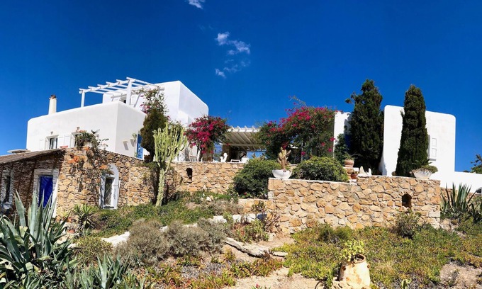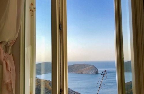 A true vacation house overlooking the sea. Hosts 8-12 people, in separate units. 5 mins from crystal clear blue waters. Verandas with vistas everywhere. Cool kitchen, several bathrooms. 15 mins drive to picturesque Ermoupoli. Lower prices off season.