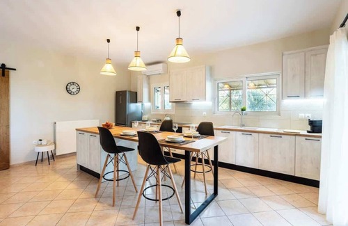 Just a 10-min drive from the beach, this modern and stylish property awaits you for the perfect getaway. Upon arriving on the premises you are welcomed by the large garden, surrounded by olive trees. The property has a wrap-around balcony with accompanying outdoor furniture, that allows you to enjoy your drink, coffee or meal. Inside, a spacious open-plan space, a living room with a double sofa bed and a plasma TV and the adjoining kitchen, fully-equipped with anything you might need to prepare your meals during your stay. Further in, two bedrooms with a comfy double bed each and a modern bathroom fitted with shower. The property has heating and is air-conditioned for the summer months. Do not miss on booking your holidays!