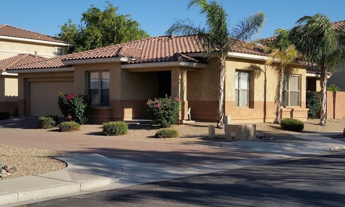 A charming 2 bedroom, 2 bath home in the Palm Valley Gated Community of Palmilla Lakes at Goodyear. Located 15 freeway miles west of the Downtown Phoenix, arts, museum & theater district, our home is a great location for your Arizona vacation. Dine on the covered patio, relax or sun in our private courtyard, walk across the street to our neighborhood heated pool (not heated from Nov to March), or play golf at one of the 2 adjacent “Palm Valley Golf & Country Club” courses. Fully equipped kitchen, gracious & comfortable furnishings throughout. Central A/C + ceiling fans in all rooms. Our den is set up with a futon for extra sleeping space. There is a washer & dryer and outside covered patio with gas grill for your convenience.