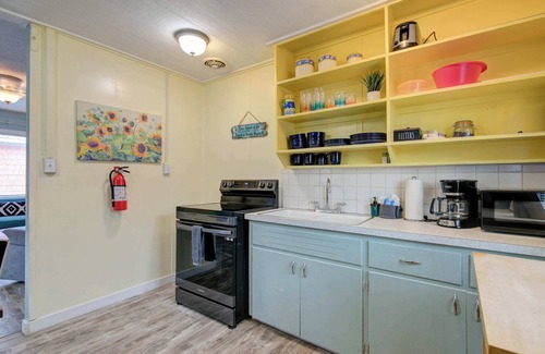 4- Kitchen is small, but comes equipped with a small drip coffee maker, microwave, refrigerator/freezer, and a stove/oven. Pots, pans and bakeware is limited due to space, so if you're planning to cook larger meals, please bring your own cook and bakeware. We do provide plenty of plates, bowls and silverware along with knives, can opener and various other kitchenware items.