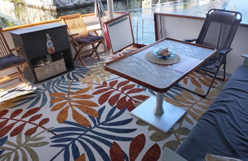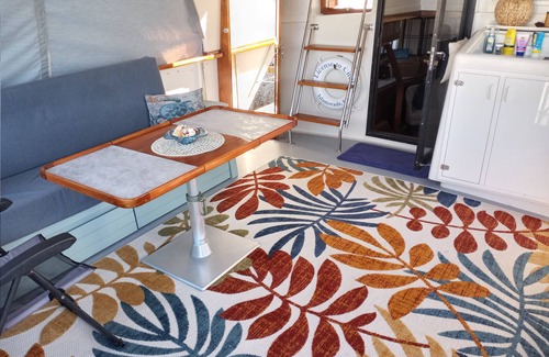 Our home is a 55 foot Californian cockpit motor yacht. Built in 1991 we lovingly maintain her ourselves,(mostly).She has 3 staterooms, 3 heads, a large salon and sundeck. The galley is complete with microwave, convection oven and a full size refrigerator. There is a on board diesel generator and portable back-up, plenty of power to run the air conditioning and all appliances simultaneously. Note: We do not leave the AC running during the day. Our guest are typically enjoying the outdoors and water activities.