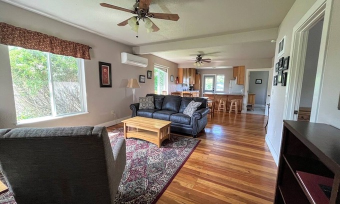 This lovely house features a queen bed in each bedroom, making it perfect for couples or families, along with a queen-sized sofa bed for additional guests. Enjoy amenities such as a smart TV with Wi-Fi compatibility for streaming your favorite shows, alongside a DVD player for cozy movie nights after celebrating your big day. The backyard boasts mature fruit trees that yield delicious apricots, apples, yellow plums, and Italian prunes during the fall, adding a touch of natural beauty to your wedding photos. Ample off-street parking accommodates boats or RVs, with the option for an RV hook-up and dump available for convenience.