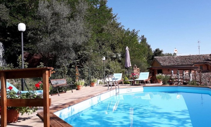 Affordable villa with private semi-sunken pool and garden near Sarnano is located in Sarnano. Affordable villa with private semi-sunken pool and garden near Sarnano provides accommodation, featuring Balcony/Terrace, Fireplace/Heating, Barbecue/Outdoor Cooking, among other amenities. This House features Balcony/Terrace, Fireplace/Heating, Barbecue/Outdoor Cooking, to make your stay a comfortable one.