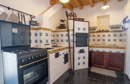 A kitchen equipped with electrical oven, fridge, freezer and an ancient wood oven.