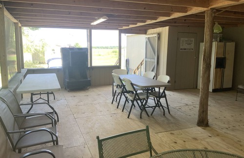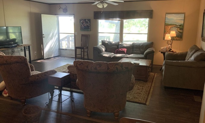 Dos Rios ranch is a Family owned, working cattle ranch 7 minutes west of Hearne Texas. Kyle field and Texas A&M are only 25 minutes away! The home boasts four bedrooms and a bunk room sleeping a total of 17! There is a 36 x 24 covered, screened in deck overlooking the Brazos River. Complete privacy On 400 acres with a fire pit and barbecue pit, full kitchen with two flat screens and WiFi. There is a small pond with access for fishing! Guided Hog hunting, dove hunting, and fishing trips on the Brazos, are available for an extra charge. Dos Rios is perfect for corporate lodging for working Crews in and around the hearne area. Aggie game day lodging is also a perfect fit for the ranch.