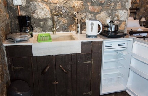 It has a single space, with wooden furniture and a double metal bed. Enjoy the view and the sound of the sea from every corner of the room. Equipped kitchen in the open space with fireplace, which includes a comfortable dining area. Big balcony. The apartment has impressive stone walls with handmade wooden constructions as well as a luxurious bathroom with shower.