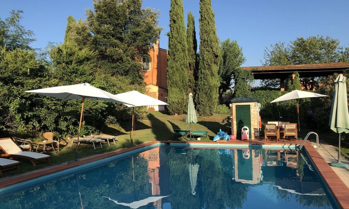 Podere Marchiano is an old farmhouse situated on the slopes of Montalbano. It is located 12 km from Vinci, birthplace of Leonardo Da Vinci, 30 km from Lucca, 40 km from Florence, 50km from Pisa, 10 km from Montecatini Terme. The house is nestled in the Tuscan countryside, rich in olive groves. Directly overlooking the Montecatini Golf Club - 18 holes. It is possible to use the services of bar and restaurant of the Golf Club House and can be booked "Green fee" in all courses in the Tuscan center. Far from crowded, noisy city, offers the ideal holiday for those who love nature and outdoor activities (golf, hiking, horseback riding) .The central location in the heart of Tuscany, makes Marchiano not only a perfect base for visiting the most important art cities but also the Versilia coast, the Abetone and Pistoia mountains: all locations within a radius of about 50 km away. The house have retained their rustic characteristics original. The apartment consists of a living room with kitchenette (freezer) and a double sofa bed, one double bedrooms and a bathroom with shower. Our guests can also take advantage of the spaces equipped appliances in the house and covered: a large shed (barn), which offers a panoramic view of the impressive environmental context of the Val di Nievole; a barbecue, swimming pool and parking surrounded by olive groves.