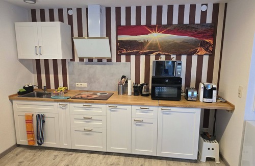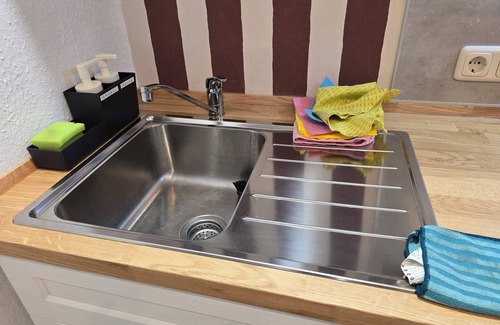 Newly built holiday apartment with almost all amenities for a comfortable stay close to nature. The equipment is almost complete, towels, bed linen, soap, shampoo, shower gel, washing-up liquid, etc. are available. A new kitchenette with ceramic hob, microwave, refrigerator, hot air fryer, food processors + all kitchen utensils are available. If required, I can provide you with a drawer in our freezer that you may need for frozen products.