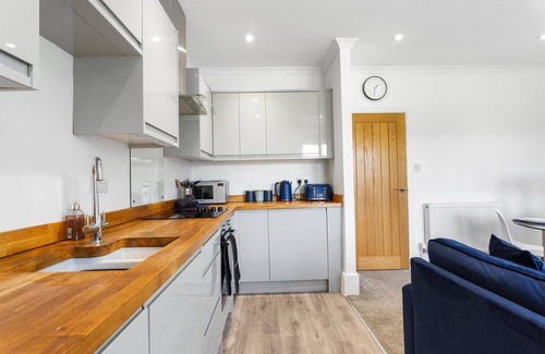 Based on the first floor of this gorgeous converted Victorian building, Ahoy There! is newly renovated offering a stylish and luxurious base for a wonderful coastal holiday. The open plan Lounge/Kitchen has incredible views across the adjacent playing fields onto Hythe Town Centre, the stunning St Leonard's Church and the pretty village of Saltwood on the hill. Relax on the sumptuous navy velvet sofa and armchair to enjoy the pretty view, or just curl up in front of the smart TV. There is a separate dining area for four people and a fully equipped kitchen with fitted oven, fridge/freezer, full size dishwasher and washing machine to cook up a storm.