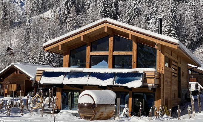 Perfect for summer trail or winter ski and the beautiful and calm inter seasons! Brand new stunning eco-luxury lodge, facing Mont Blanc and the Grand Montets in the sun-kissed gem of a hamlet, Les Frasserands. The owners have built this beautiful mix of classic chalet and contemporary home to the highest possible sustainability standards, from geothermal and solar heating, to the choices of eco-responsable paints, mattresses, insulation and low energy choices throughout - but coupled with high-spec endless pool (indoor), outdoor jacuzzi and sauna, and premium fitout throughout. Perfect for business seminars to a three family stay, year around attractions in the Chamonix valley.