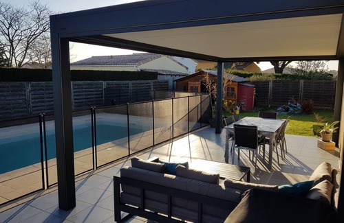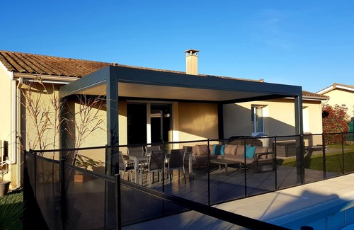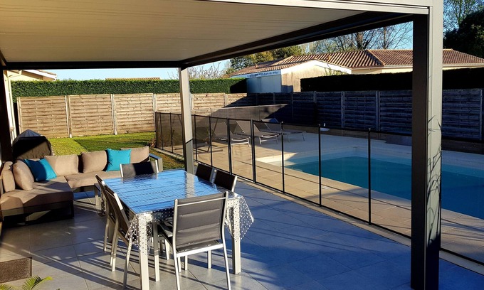 Ideally located in the heart of the vineyards of Bordeaux, 15 minutes from Bordeaux and 20 minutes from Saint-Emilion, this contemporary house of 100 m2 includes a large living room with fully equipped kitchen, embellished with a central island and a bar, storeroom with washing machine, living room with a large sofa of three and a half seats, flat screen TV, a bathroom with shower and bath, two bedrooms each with a large bed 160x200cm, convertible 118x205cm in the office, private garden, trees and closed of 800 m2, a private swimming pool (7mx3,5m) and reassured by a barrier, terrace with barbecue.