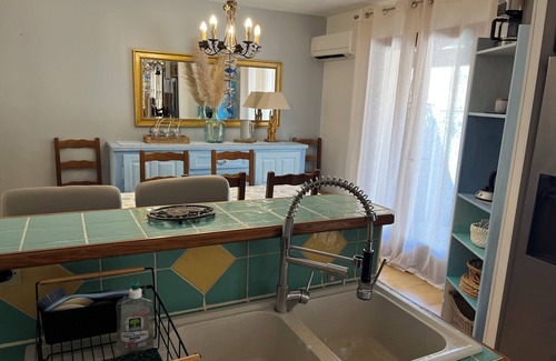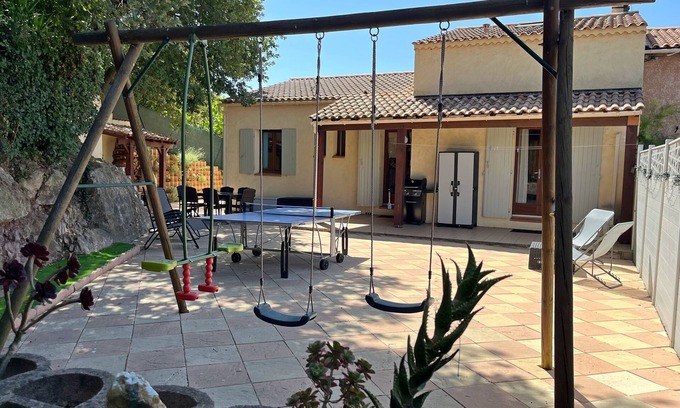 Beautiful air-conditioned house in a very quiet neighborhood, nicely located a few minutes away from the most beautiful beaches of the area, with an easy access to downtown Hyeres with its restaurants and interests. Its back yard is completely private, nicely shaded and furnished with elegant table and chairs, a barbecue grill, a ping-pong table and a basket ball hoop. Stay cool with the air-conditioning. Games, DVD's, plenty of books, baby travel bed, etc...at your disposal!