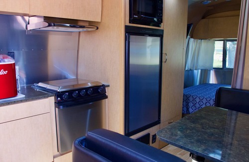 The AirStream is designed to maximize space without sacrificing comfort with features from a Queen bed with a lake view, AC, cooking stove, fridge & Coffee maker.