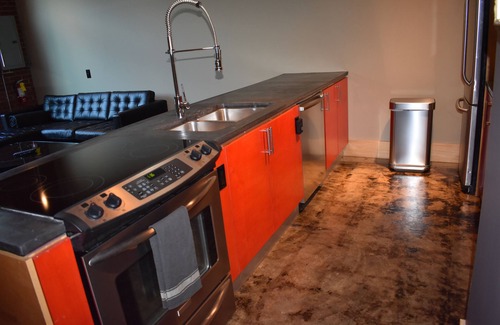 Landing gear locked, flaps down then a short taxi across the tarmac lands you in one of our seven 1,200 square foot Hangar Lofts for an evening to embrace. Our lofts have all the dials and gauges you’d expect in an emerging urban landscape ranging from exposed brick walls, structural steel beams, concrete floors and countertops to oversized commercial-styled glass windows for private patio spectating. The Baltic-birch custom cabinetry frames the modern kitchen, containing the soft-spoken beauty of stainless Bosch appliances. The 17-foot tall ceilings are accented with exposed aluminum spiral ductwork hung as a backdrop to a ceiling made of clear-finished tongue & groove boards. These lofts also contain loads of intimate lighting tailored for your perfect evening