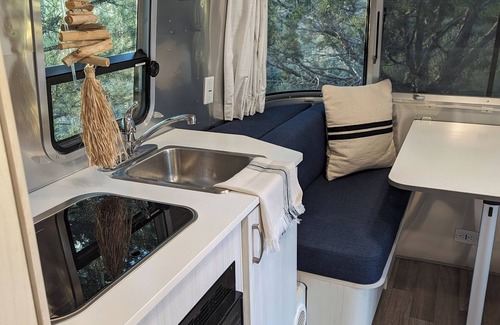 You will be staying on a four acre property that is shared with the owners who live in the back of the property. The rental is tucked into nature surrounded by trees giving lots of space and privacy. The Airstream is fully outfitted with dishes, pots, pans, French press, coffee grinder, coffee, tea, kettle, utensils. There is a double bed in the cozy back corner with two windows and a TV that hits the spot after a long day on the trails or for when you just want to escape with a good book. The dinette can also be converted to a bed if each guest would prefer their own sleeping arrangement.