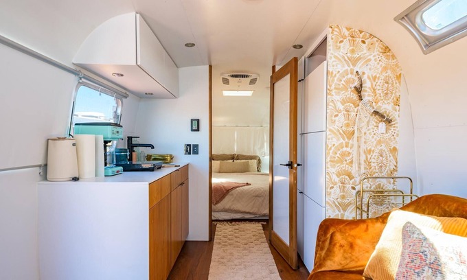 This stylish Airstream offers a one-of-a-kind glamping experiencecomplete with your own private hot tub, fenced patio, and outdoor lounge for the perfect blend of comfort and adventure.