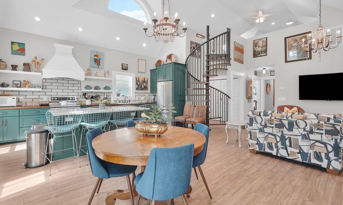 The primary bedroom is situated at the back of the home, featuring a king bed, an ensuite bathroom with a luxurious walk-in shower, and private access to a screened-in porch. Just down the hall, the second bedroom offers a queen bed, with a full bathroom across the hall that includes a tub-shower combination. Up the spiral staircase off the living room, guests will find a twin trundle daybed, perfect for children or traveling singles.